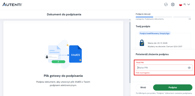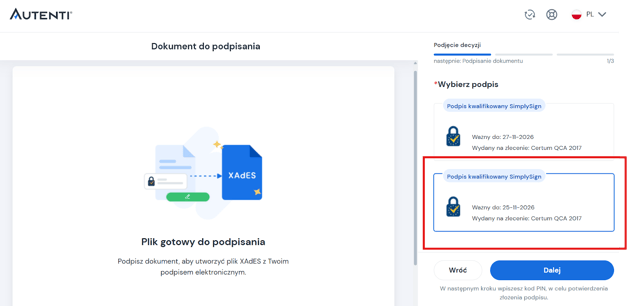 - Na swoim koncie SimplySign możesz mieć więcej niż 1 podpis kwalifikowany. Wybierz ten, który odpowiada pieczęci Twojej organizacji.