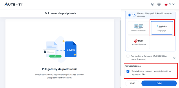 - Na kolejnym ekranie wybierz podpis kwalifikowany SimplySign oraz zaakceptuj Oświadczenie.