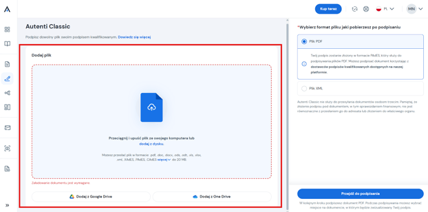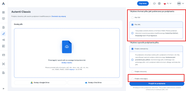 - Wybierz format pliku który chcesz podpisać - PDF lub XML.