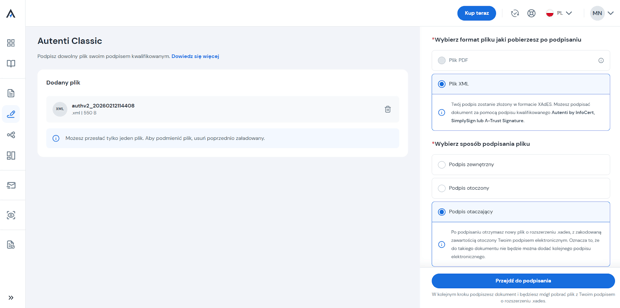 - W przypadku plików XML możesz wybrać sposób podpisania pliku.